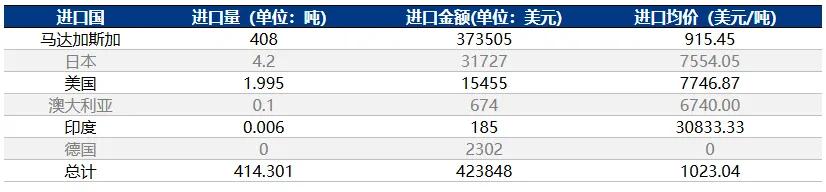 2024年10月,中國鱗片石墨進(jìn)口量按產(chǎn)銷國統(tǒng)計,排名在前三位的分別是:馬達(dá)加斯加、日本、美國。其中馬達(dá)加斯加進(jìn)口量約占當(dāng)月總進(jìn)口量的98.55%。