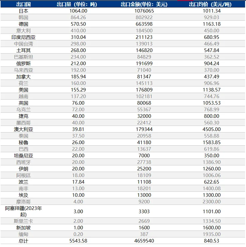 2024年10月,中國鱗片石墨出口量按產(chǎn)銷國統(tǒng)計,排名在前五位的分別是:日本、韓國、德國、意大利和印度尼西亞。這五個國家的出口量之和為3218.8噸,約占當(dāng)月總出口量的58%。