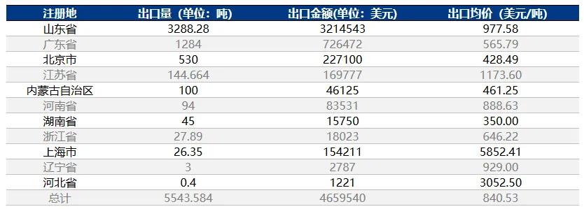 2024年10月,中國鱗片石墨出口量按注冊地名稱統(tǒng)計,排名前五位的為:山東省、廣東省、北京市、江蘇省、內(nèi)蒙古自治區(qū)。這五個省份合計出口量為5346.9噸,占比達(dá)96.46%。