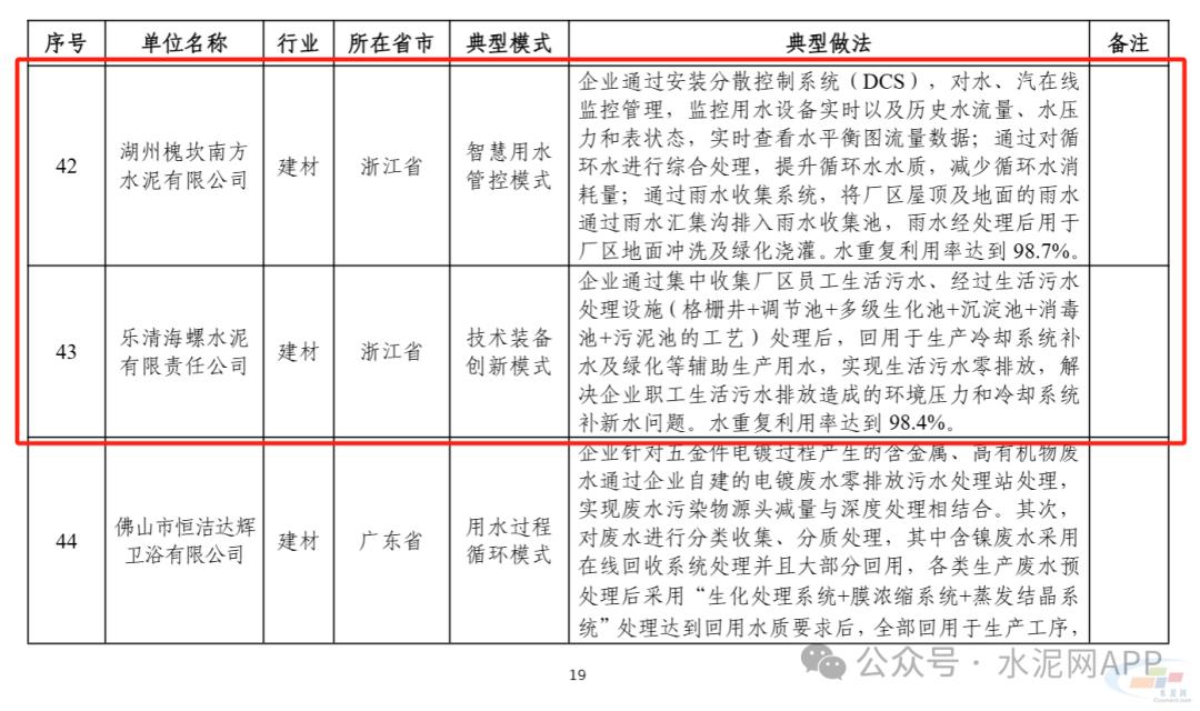其中,湖州槐坎南方水泥有限公司的“智慧用水管控模式”;樂清海螺水泥有限責(zé)任公司的“技術(shù)裝備創(chuàng)新模式”擬被列入2024年工業(yè)廢水循環(huán)利用典型案例名單中。