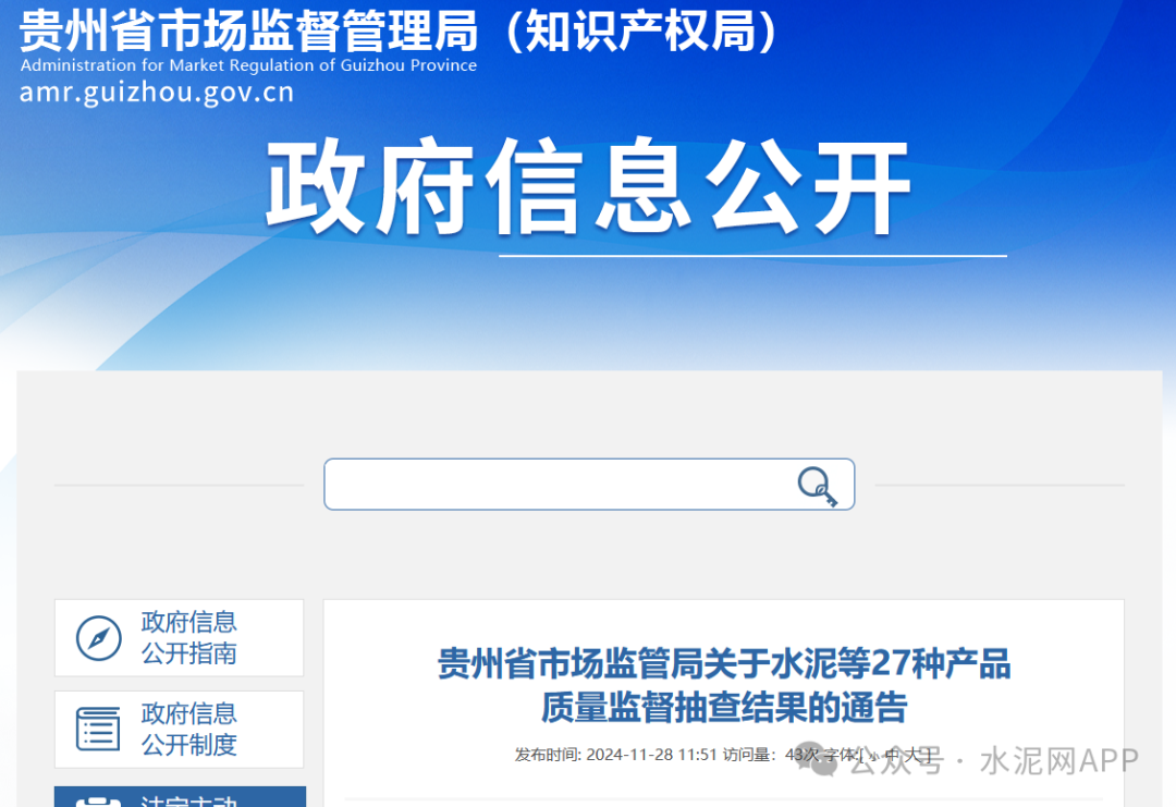 日前,貴州省市場監(jiān)管局公布《關(guān)于水泥等27種產(chǎn)品質(zhì)量監(jiān)督抽查結(jié)果的通告》。