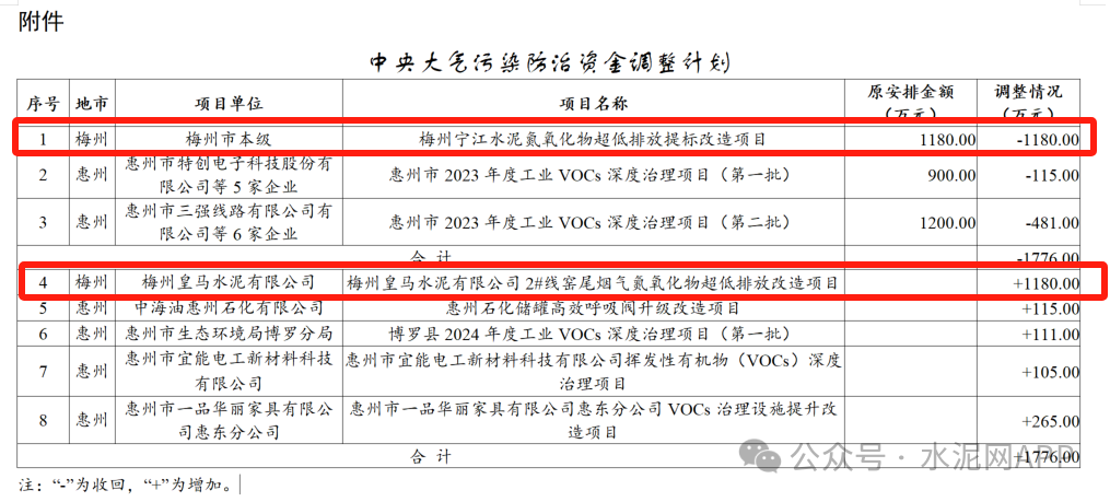公示顯示,收回原安排梅州寧江水泥氮氧化物超低排放提標改造項目資金1180萬元。