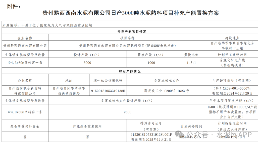 置換方案顯示,貴州黔西西南水泥3000t/d熟料項目置換補(bǔ)充產(chǎn)能1000t/d,出讓產(chǎn)能來自貴州西南聯(lián)合新材料科技公司,置換比例1.5:1。
