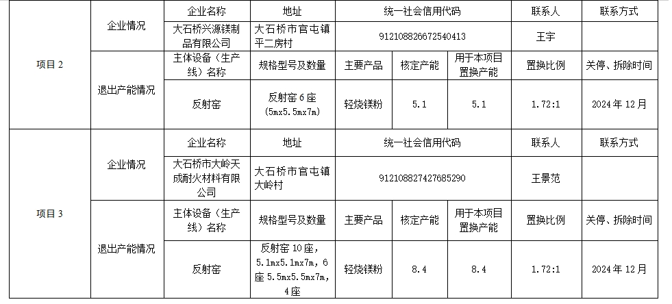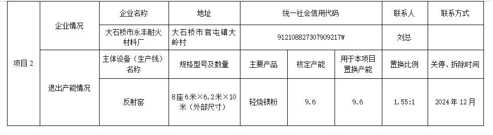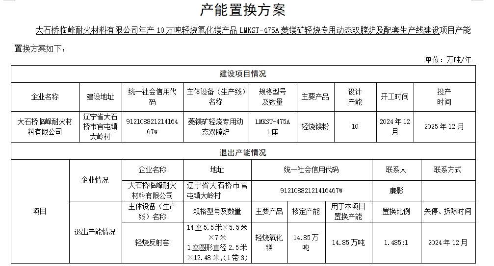 大石橋臨峰耐火材料有限公司產(chǎn)能置換方案表