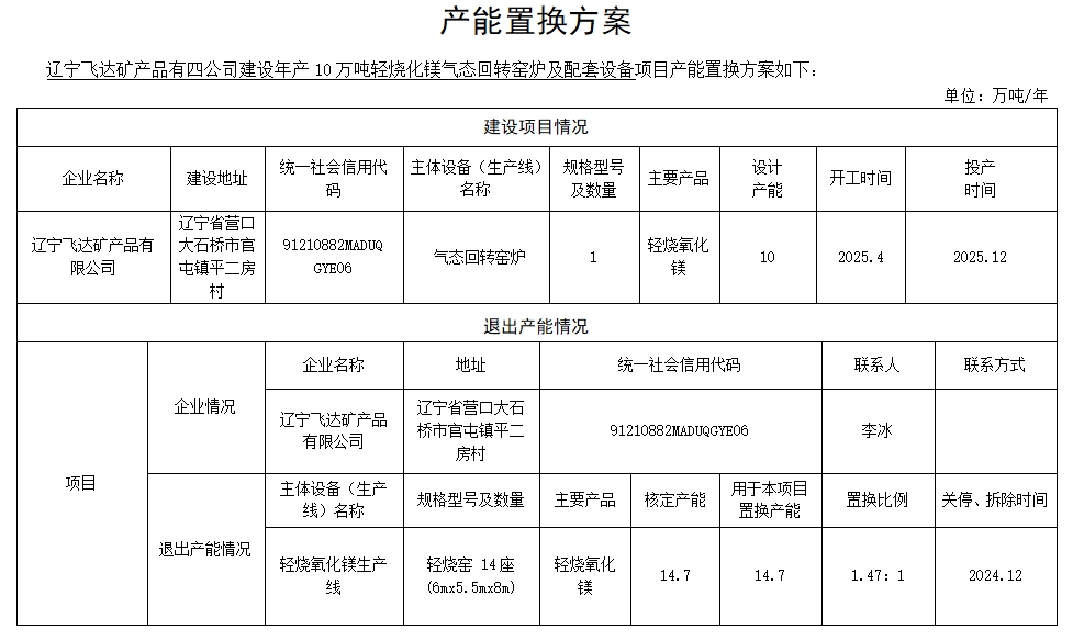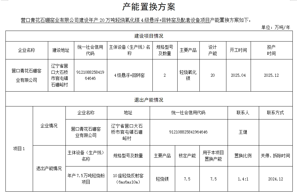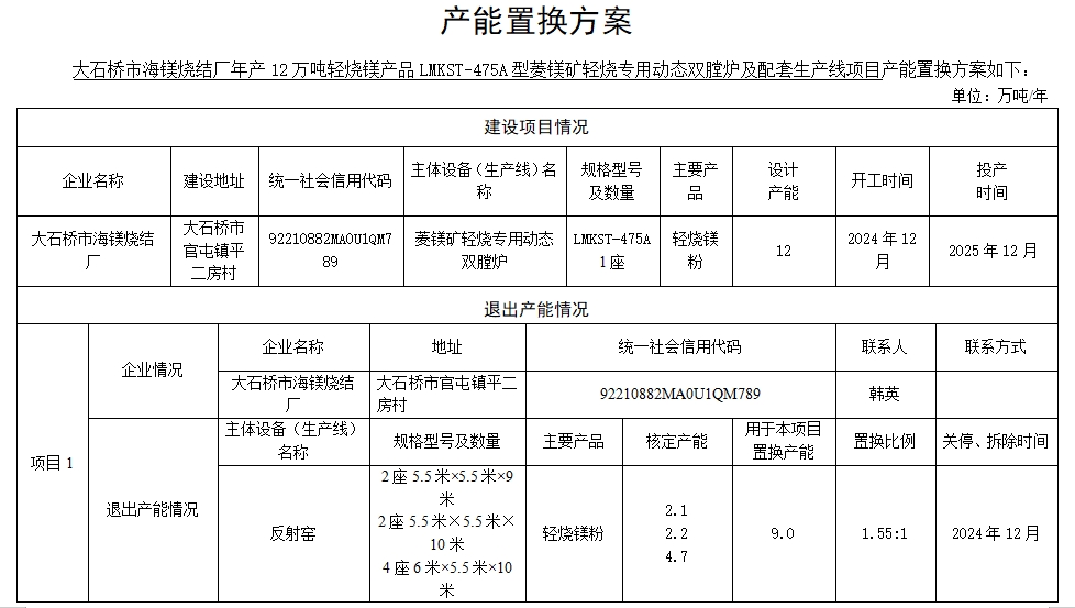 大石橋市海鎂燒結(jié)廠產(chǎn)能置換方案表