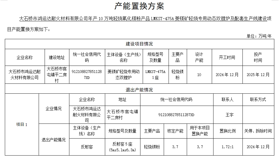 大石橋市鴻運(yùn)達(dá)耐火材料有限公司產(chǎn)能置換方案表