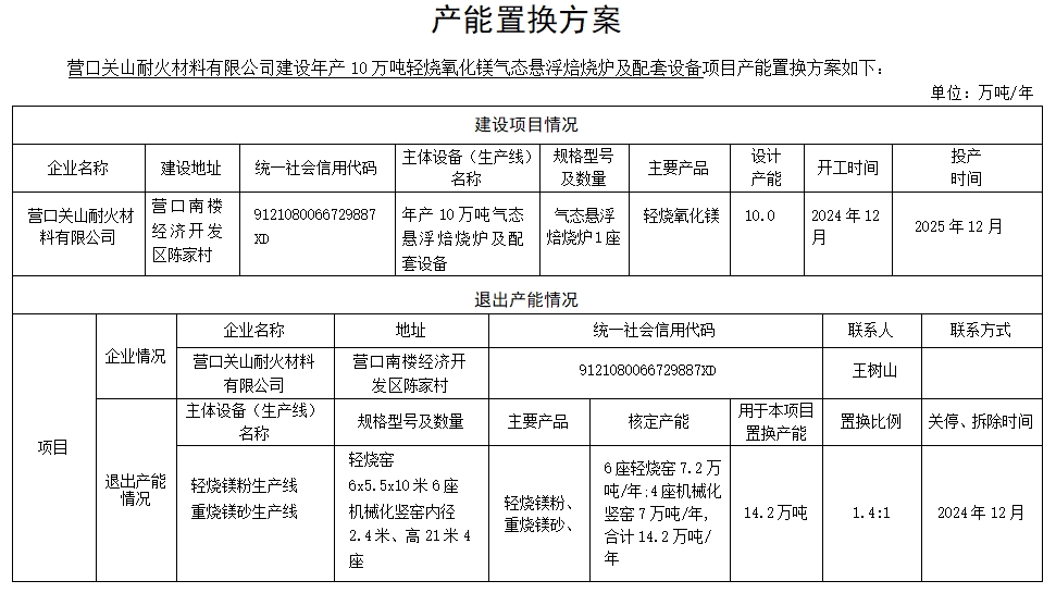 營(yíng)口關(guān)山耐火材料有限公司產(chǎn)能置換方案表