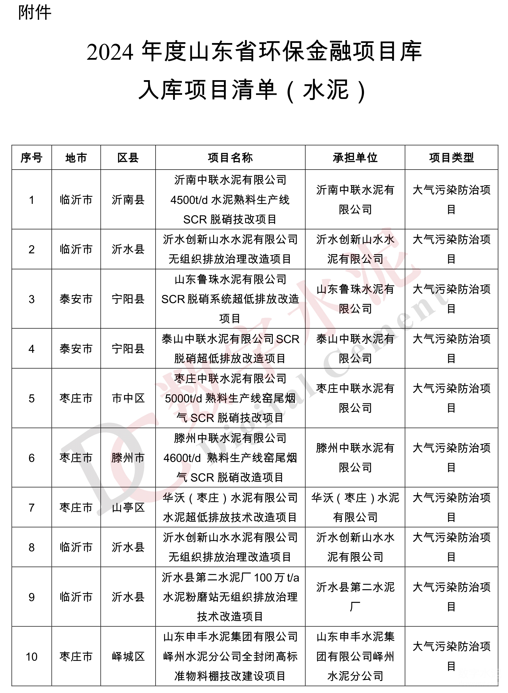 根據(jù)公示,中聯(lián)、山水等多家水泥企業(yè)技改項(xiàng)目擬入選《2024年度山東省環(huán)保金融項(xiàng)目庫(kù)入庫(kù)項(xiàng)目清單》。