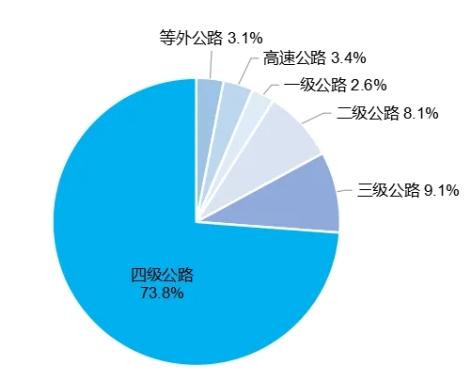 年末全國(guó)國(guó)道里程38.40萬(wàn)公里,省道里程40.41萬(wàn)公里。農(nóng)村公路里程459.86萬(wàn)公里,其中縣道里程69.67萬(wàn)公里、鄉(xiāng)道里程124.28萬(wàn)公里、村道里程265.91萬(wàn)公里。