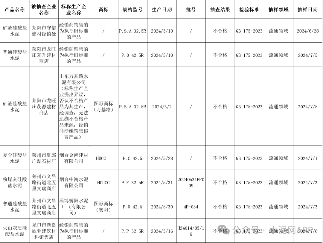 其中查出7批次水泥產(chǎn)品質(zhì)量不合格,見下圖: