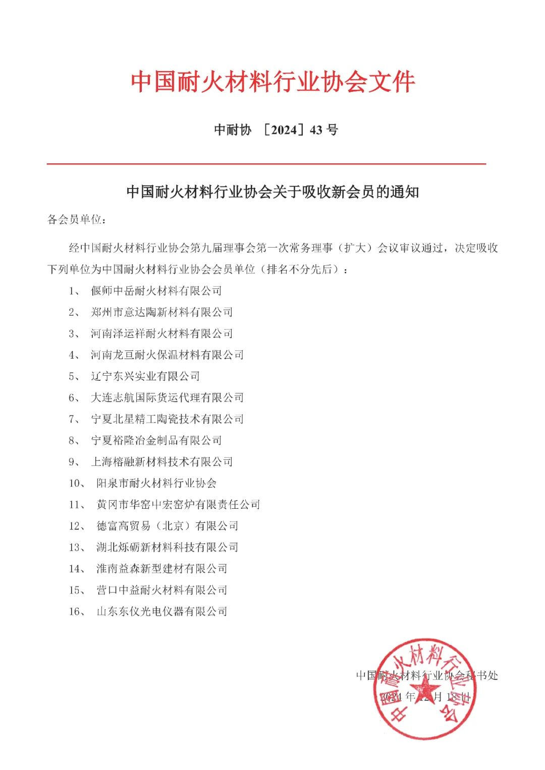 經(jīng)中國耐火材料行業(yè)協(xié)會第九屆理事會第一次常務(wù)理事(擴大)會議審議通過,決定吸收下列單位為中國耐火材料行業(yè)協(xié)會會員單位(排名不分先后):
