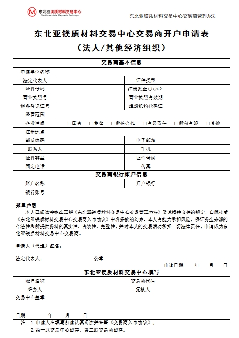 第五條 申請(qǐng)交易中心交易商,須填寫(xiě)《交易商開(kāi)戶申請(qǐng)表》,并按交易中心要求提供相關(guān)文件。