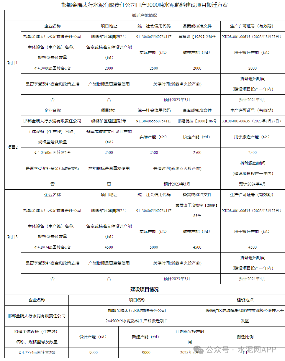 其中續(xù)建項目中包含:邯鄲金隅太行2×4500t/d水泥窯協(xié)同處置固廢生產(chǎn)線搬遷項目(峰峰礦區(qū))。據(jù)河北工信廳,邯鄲金隅太行水泥有限責任公司日產(chǎn)9000噸水泥熟料建設項目搬遷方案如下: