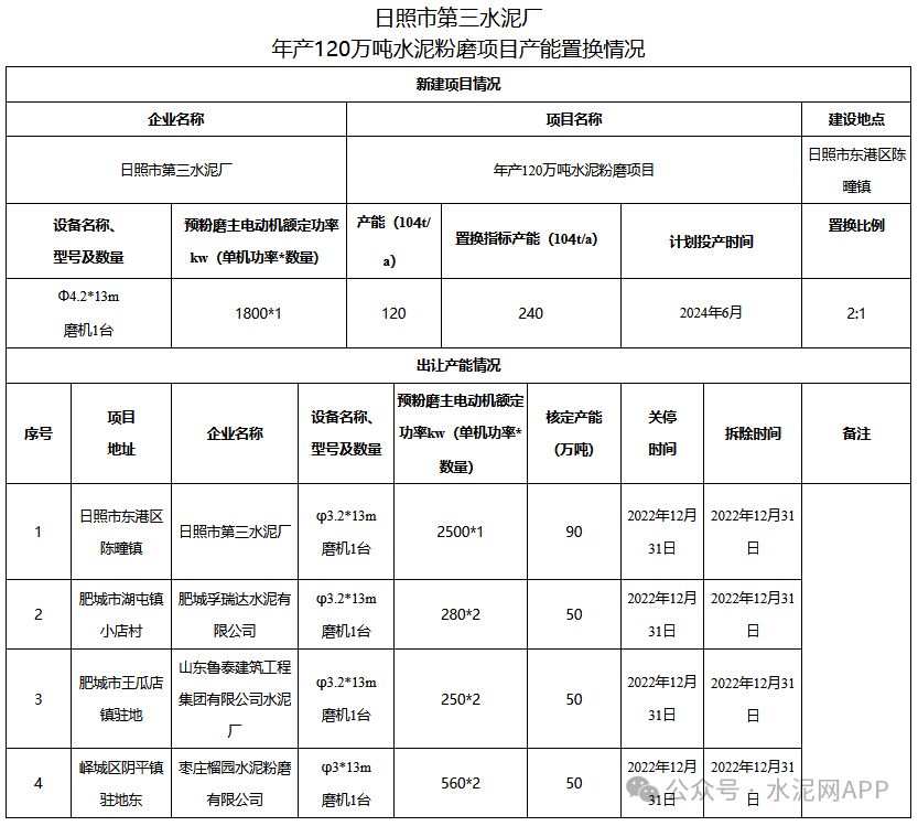 2022年8月8日公告的日照市第三水泥廠年產(chǎn)120萬噸水泥粉磨項(xiàng)目,日照市第三水泥廠決定不再實(shí)施,現(xiàn)予以公告。原產(chǎn)能置換情況如下: