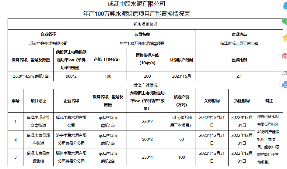 2022年10月19日公告的成武中聯(lián)水泥年產(chǎn)100萬噸產(chǎn)線產(chǎn)能置換項(xiàng)目,中聯(lián)集團(tuán)決定不再實(shí)施。中聯(lián)集團(tuán)擬將該方案中滕州中聯(lián)曹縣分公司100萬噸產(chǎn)能指標(biāo),調(diào)配用于魯南中聯(lián)新建年產(chǎn)130萬噸水泥粉磨項(xiàng)目。