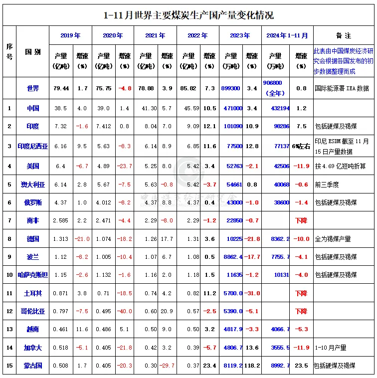2024年1-11月世界主要煤炭生產(chǎn)國(guó)產(chǎn)量變化情況