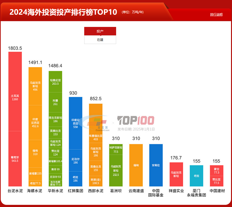 1月1日,中國水泥網(wǎng)發(fā)布“2024中國水泥熟料產(chǎn)能百強(qiáng)榜”,其中包含2024海外投資投產(chǎn)排行榜TOP10。榜單顯示,臺(tái)泥、海螺、華新位于前三。