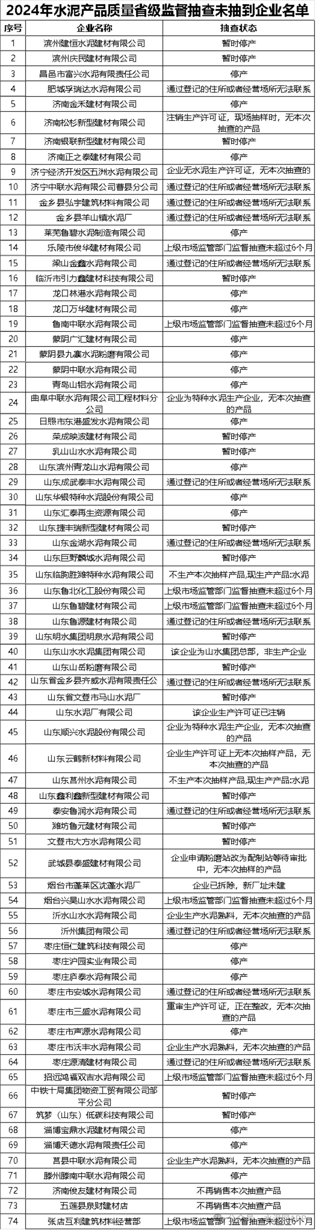近日,山東省市場監(jiān)管局發(fā)布2024年水泥產(chǎn)品質(zhì)量省級監(jiān)督抽查結(jié)果。經(jīng)查,2批次水泥產(chǎn)品不合格,221批次水泥產(chǎn)品合格,74家企業(yè)未抽到。