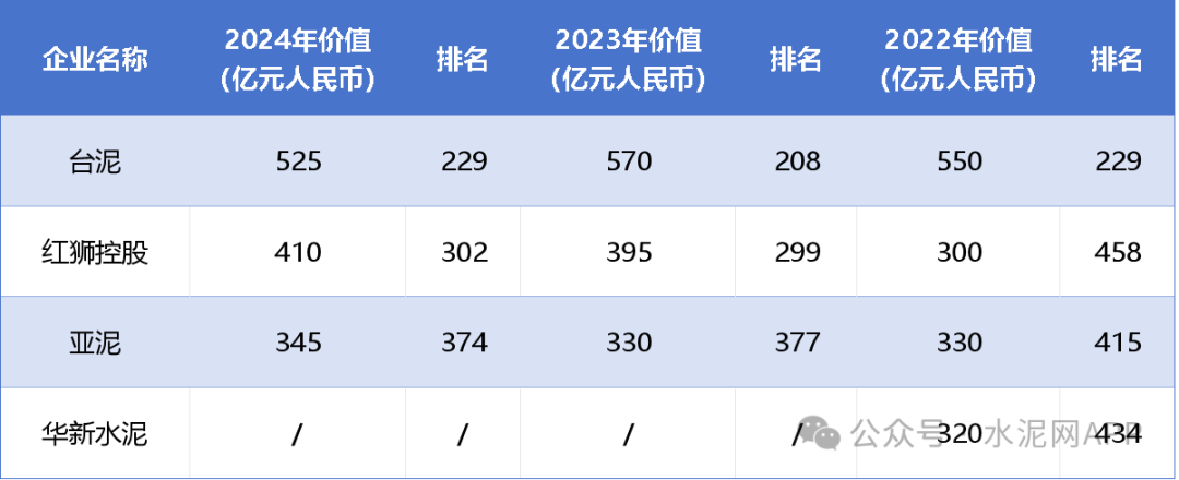 2月25日,胡潤研究院發(fā)布《2024胡潤中國500強》榜單,列出了中國500強非國有企業(yè),按照企業(yè)價值進行排名。這是胡潤研究院連續(xù)第六次發(fā)布“胡潤中國500強”。 其中水泥行業(yè):臺灣水泥排名第229位;紅獅控股排名第302位;亞洲水泥排名第374位。