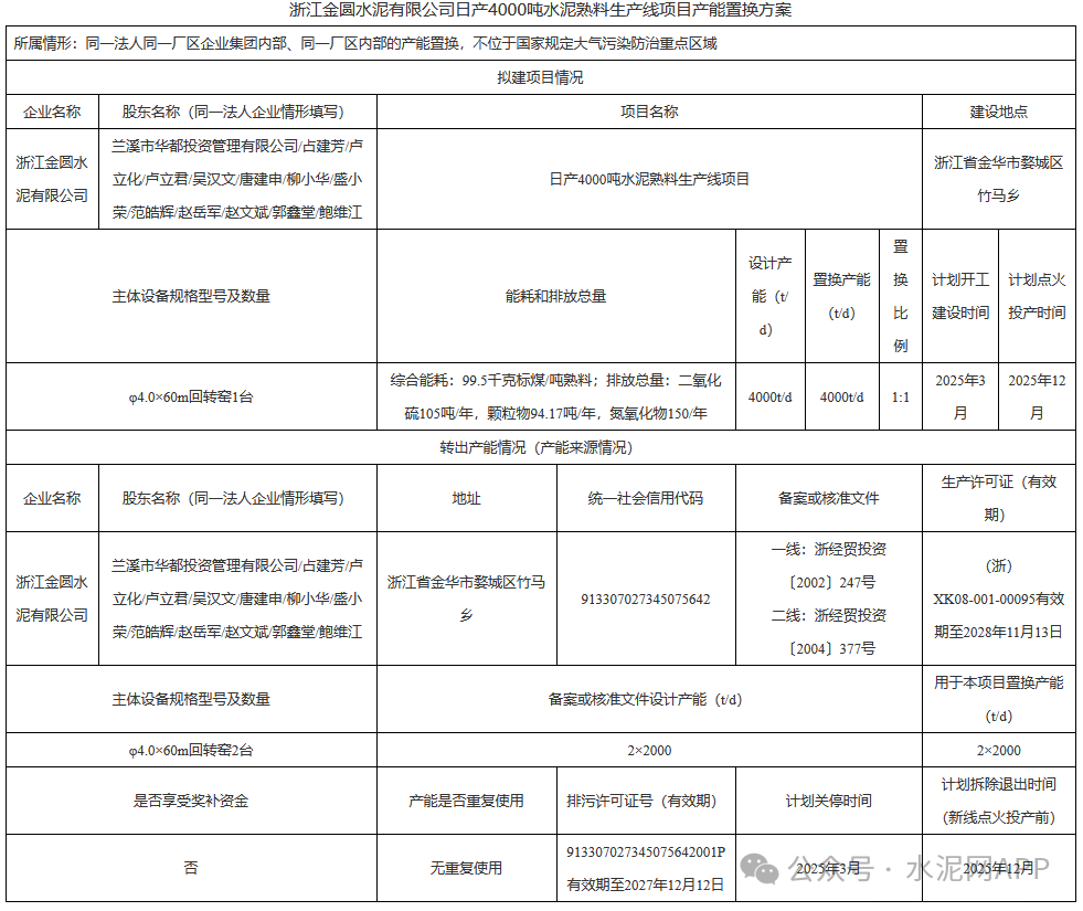 置換方案顯示,金圓水泥擬建4000t/d熟料生產(chǎn)線項目,出讓產(chǎn)能來自同公司2*2000t/d熟料生產(chǎn)線,置換比例1:1。項目計劃開工時間2025年3月,計劃點(diǎn)火時間2025年12月。