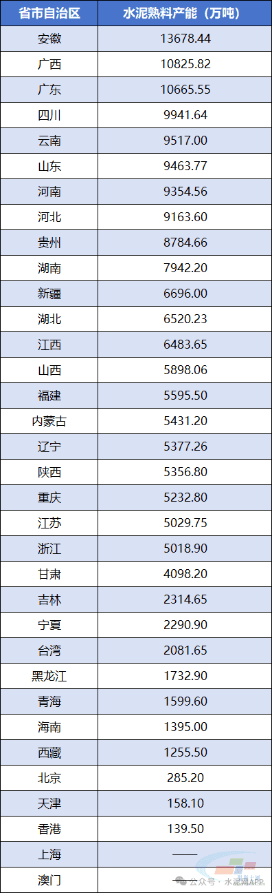 中國(guó)水泥網(wǎng)大數(shù)據(jù)顯示,截止到2024年底,全國(guó)共有已投產(chǎn)水泥熟料生產(chǎn)線1517條,合計(jì)熟料產(chǎn)能17.93億噸。 從地區(qū)分布來(lái)看,安徽、廣西、廣東三個(gè)省熟料產(chǎn)能均超過(guò)億噸,在全國(guó)排名前三,上海與澳門則沒有熟料產(chǎn)能布局。