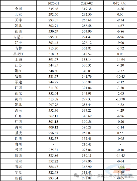 表:2月份全國(guó)30個(gè)省市C30預(yù)拌混凝土平均價(jià)格及變化情況(元/方,%)