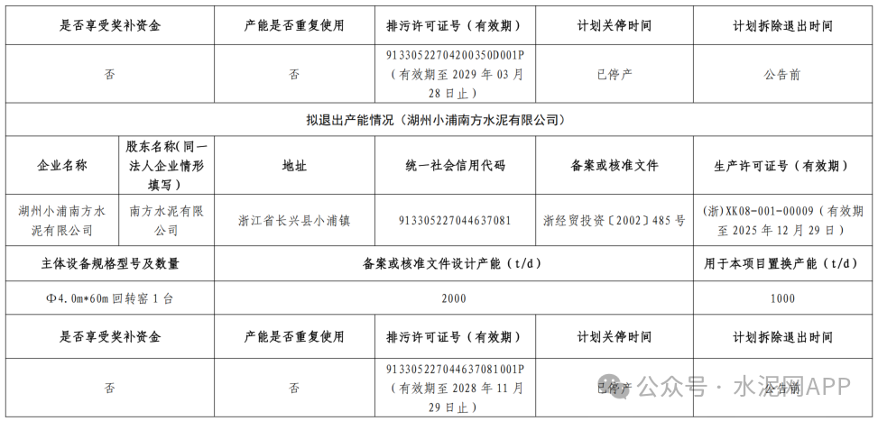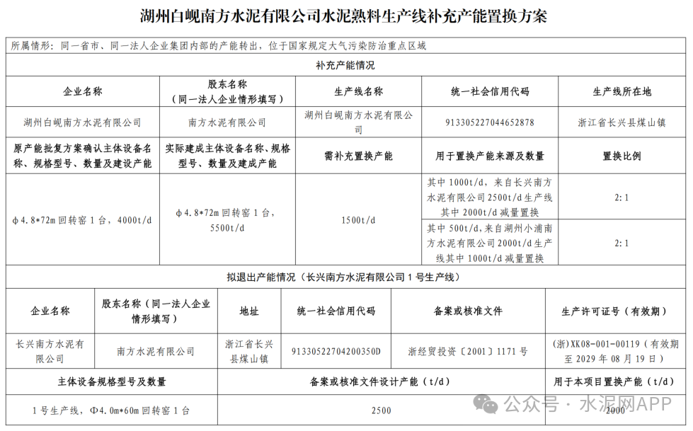 補(bǔ)充置換方案顯示:湖州槐坎南方水泥1號(hào)線置換補(bǔ)充產(chǎn)能1250t/d;湖州槐坎南方水泥2號(hào)線置換補(bǔ)充產(chǎn)能1000t/d;
