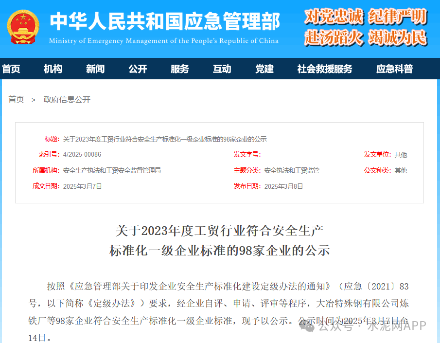近日,國家應(yīng)急管理部發(fā)布關(guān)于2023年度工貿(mào)行業(yè)符合安全生產(chǎn)標(biāo)準(zhǔn)化一級(jí)企業(yè)標(biāo)準(zhǔn)的98家企業(yè)的公示。
