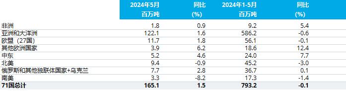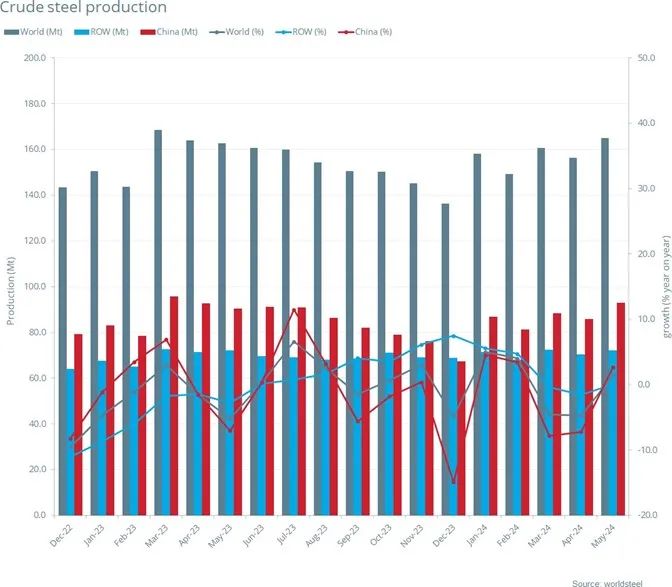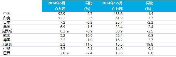 2024年5月,全球71個(gè)納入世界鋼鐵協(xié)會(huì)統(tǒng)計(jì)國(guó)家或地區(qū)的粗鋼產(chǎn)量為1.651億噸,同比增長(zhǎng)1.5%。