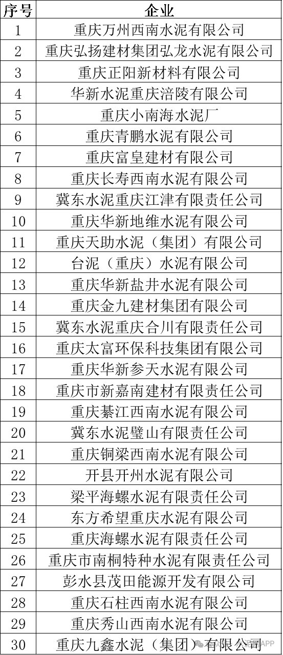 根據(jù)公布的名單,30家水泥企業(yè)納入《2024年度重慶市納入全國碳排放權(quán)交易市場(chǎng)發(fā)電外其他行業(yè)重點(diǎn)排放單位名錄》。