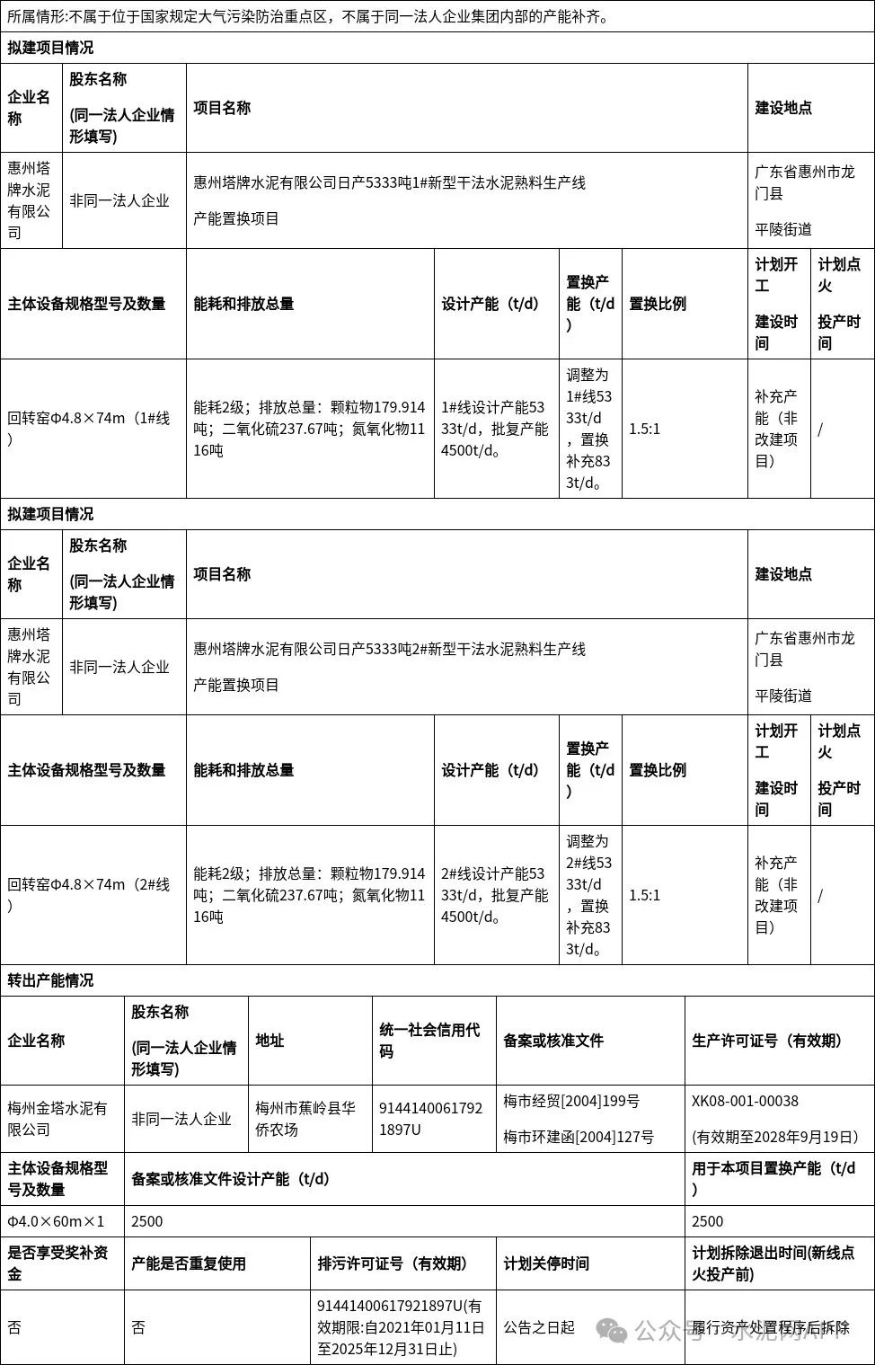 置換方案顯示,惠州塔牌水泥兩條4500t/d熟料生產(chǎn)線各置換補充產(chǎn)能833t/d,補充后兩條生產(chǎn)線產(chǎn)能均為5333t/d。退出產(chǎn)能為梅州金塔水泥公司2500t/d熟料生產(chǎn)線,置換比例1.5:1。