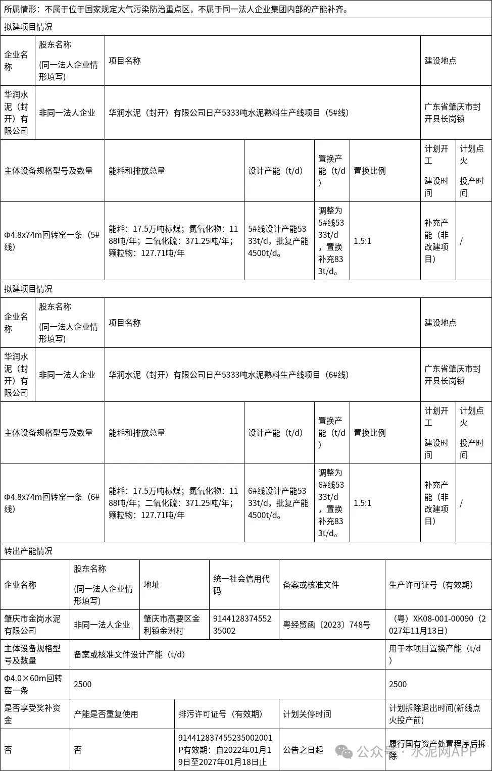 華潤水泥(封開)有限公司兩條4500t/d熟料生產(chǎn)線各置換補充產(chǎn)能833t/d,補充后兩條生產(chǎn)線產(chǎn)能均為5333t/d。退出產(chǎn)能為肇慶市金崗水泥2500t/d熟料生產(chǎn)線,置換比例1.5:1。