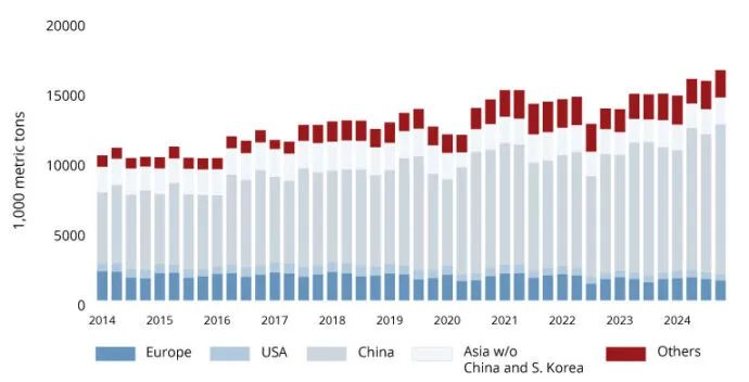 世界不銹鋼協(xié)會(huì)發(fā)布的數(shù)據(jù)表明,2024年,全球不銹鋼粗鋼產(chǎn)量為6260萬噸,同比提高7%。