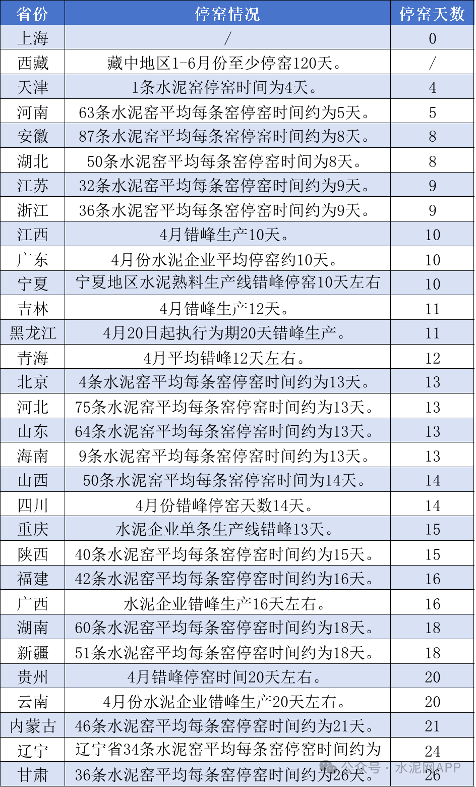 據(jù)了解,近期多地開啟新一輪錯(cuò)峰停產(chǎn)。據(jù)河北省建筑材料工業(yè)協(xié)會(huì)發(fā)布,4月-10月(7個(gè)月)非采暖季期間,全省水泥熟料生產(chǎn)企業(yè)自律錯(cuò)峰生產(chǎn)停窯合計(jì)85天。其中4月至6月、10月:每月自律錯(cuò)峰生產(chǎn)停窯10天,一般安排在每月下旬。7月至9月:每月自律錯(cuò)峰生產(chǎn)停窯15天,一般安排在每月中下旬。