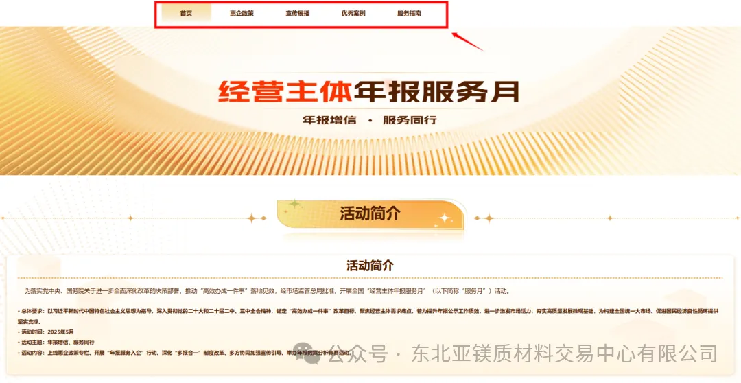 三、進(jìn)入“經(jīng)營(yíng)主體年報(bào)服務(wù)月”頁(yè)面后,可在上方選擇不同的子頁(yè)面閱覽各類信息,通過(guò)“惠企政策”“宣傳展播”“優(yōu)秀案例”等專欄可充分了解年報(bào)報(bào)送要求、注意事項(xiàng)、常見問(wèn)題等信息,幫助大家更高效地掌握年報(bào)重點(diǎn),提前規(guī)避可能存在的“坑”。