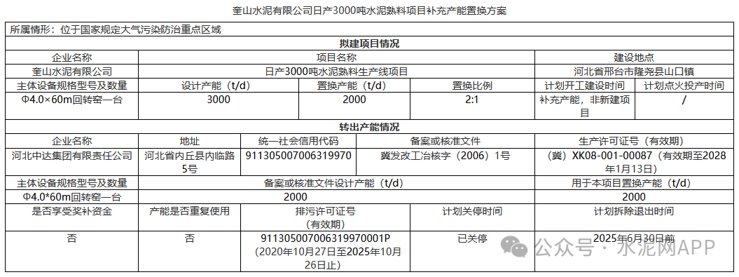 根據(jù)公示,奎山水泥日產(chǎn)3000噸水泥熟料生產(chǎn)線項目原生產(chǎn)線備案產(chǎn)能2000t/d,補充產(chǎn)能后為3000t/d,置換比例為2:1。河北中達集團有限責任公司2000t/d熟料線用于本項目置換產(chǎn)能,計劃2025年6月30日前拆除退出。