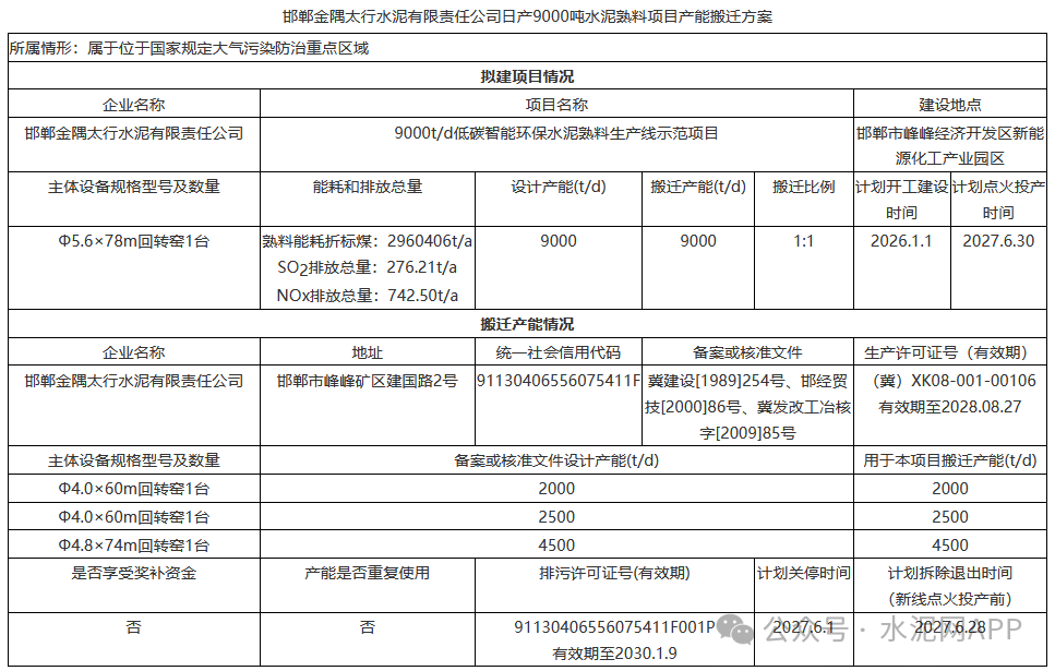 公告顯示,邯鄲金隅太行水泥擬建9000t/d低碳智能環(huán)保水泥熟料生產(chǎn)線示范項(xiàng)目,退出產(chǎn)能來(lái)自同公司一條2000t/d、一條2500t/d、一條4500t/d,置換比例1:1。計(jì)劃開(kāi)工建設(shè)時(shí)間2026年1月1日,計(jì)劃點(diǎn)火投產(chǎn)時(shí)間2027年6月30日。