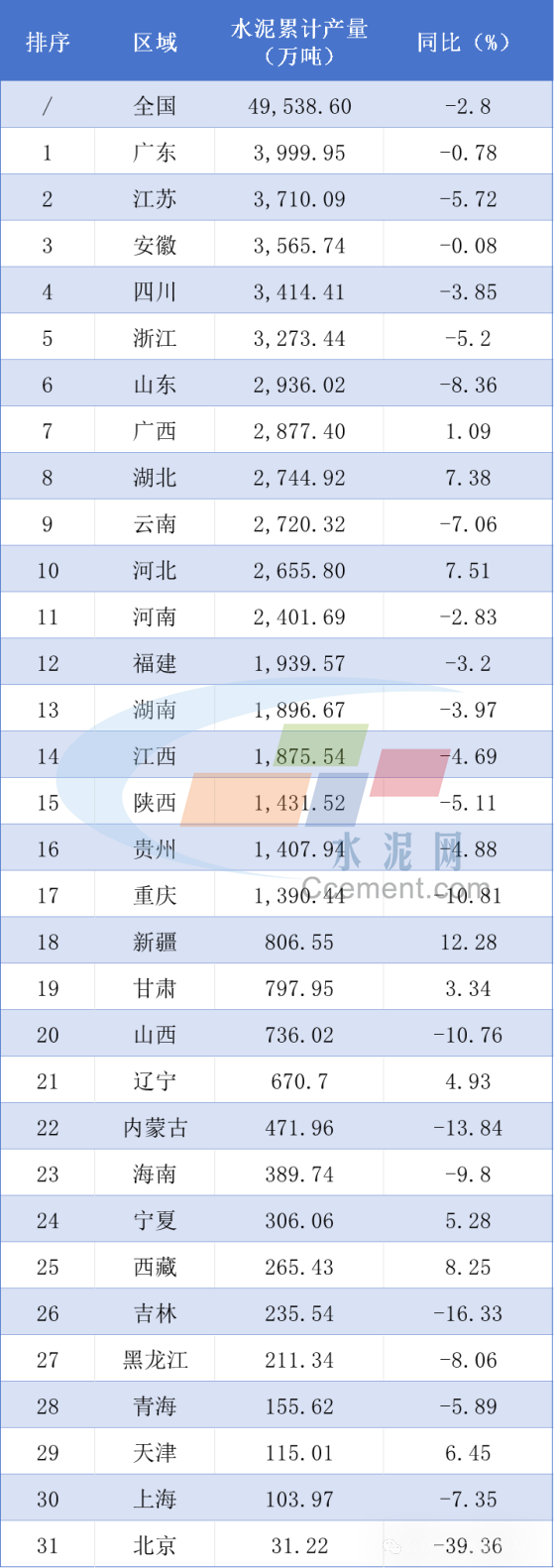 1-4月全國及地區(qū)水泥產(chǎn)量