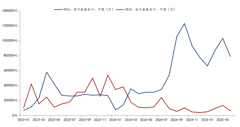 圖1.2023-2025年鋼坯進(jìn)出口走勢(shì)圖