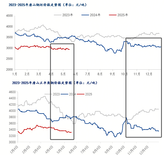從圖中可以看出,自2024年三季度末四季度初開始,鋼坯價(jià)格走勢(shì)相對(duì)平穩(wěn),其價(jià)格的抗跌性明顯優(yōu)于其下游的軋鋼材品種,調(diào)坯軋鋼企業(yè)因需求及利潤(rùn)不佳所導(dǎo)致的開工率下滑以及對(duì)鋼坯需求量減少(2025年1-5月唐山43家調(diào)坯軋鋼鐵企業(yè)周度鋼坯需求量均值同比下降5.43%)的負(fù)反饋并未完全傳導(dǎo)至鋼坯端,出口的強(qiáng)勁表現(xiàn)為鋼坯價(jià)格起到托撐作用,甚至企業(yè)為優(yōu)先保證出口而調(diào)整鐵水流向。