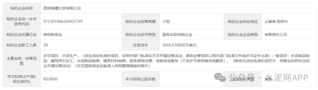 據(jù)某產(chǎn)權(quán)交易平臺顯示,近日昆明海螺水泥有限公司80%股權(quán)及19,503萬元債權(quán)轉(zhuǎn)讓預(yù)公告發(fā)布。該企業(yè)由海螺水泥持股80%,德宏發(fā)展持股20%。