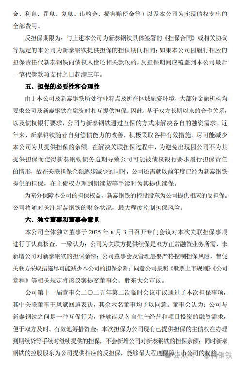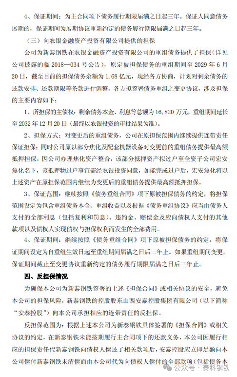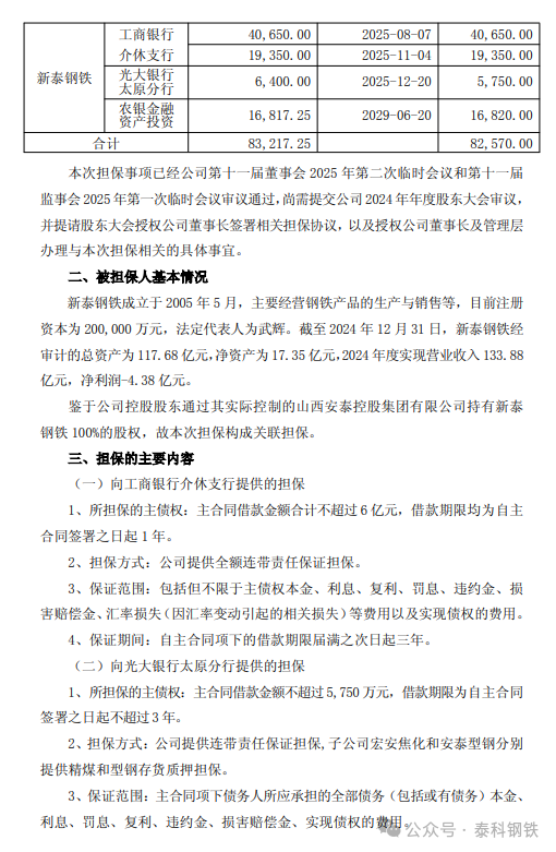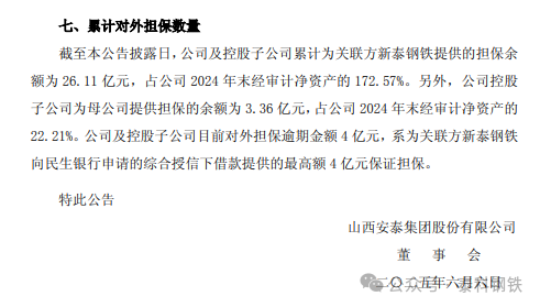 本次擔保由新泰鋼鐵的控股股東山西安泰控股集團有限公司提供了反擔保,并需提交公司2024年年度股東大會審議。目前,公司及控股子公司累計為新泰鋼鐵提供的擔保余額占公司2024年末經(jīng)審計凈資產(chǎn)的 172.57%。此外,公司及控股子公司對外擔保逾期金額達4億元。