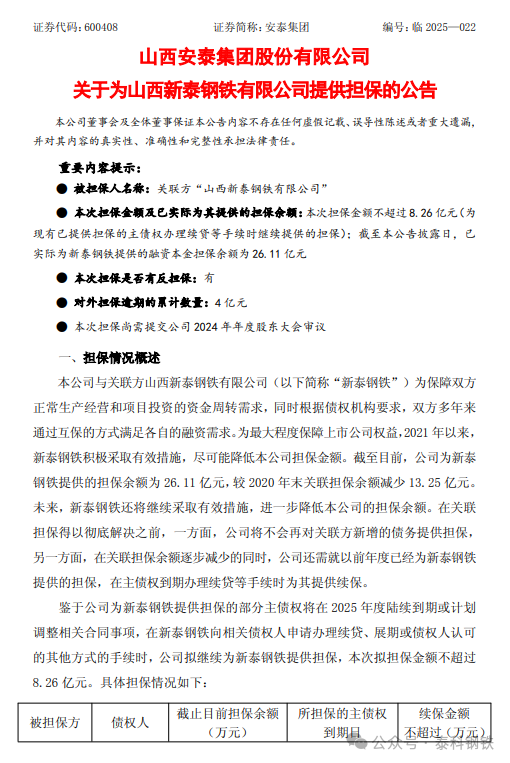 6月6日,安泰集團發(fā)布公告稱,將為關(guān)聯(lián)方山西新泰鋼鐵有限公司提供不超過8.26億元的擔保,主要用于現(xiàn)有已提供擔保的主債權(quán)辦理續(xù)貸等手續(xù)時繼續(xù)提供的擔保。截至公告披露日,公司已實際為新泰鋼鐵提供的融資本金擔保余額為26.11億元。