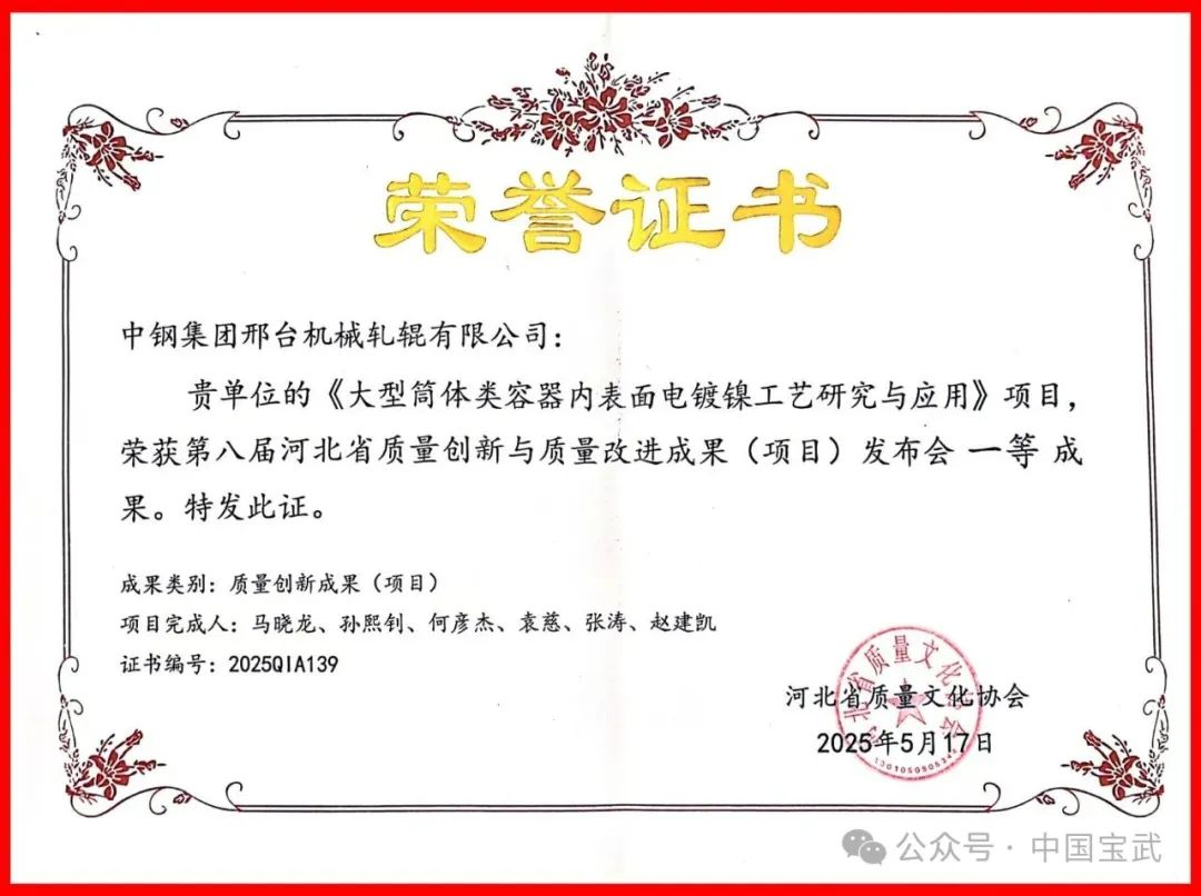 近日,在第八屆河北省質(zhì)量創(chuàng)新與質(zhì)量改進(jìn)成果發(fā)布會(huì)暨經(jīng)驗(yàn)交流會(huì)上,寶武智維、寶武重工中鋼邢機(jī)《大型筒體類容器內(nèi)表面電鍍鎳工藝研究與應(yīng)用》《打造熱處理數(shù)字化車間》《無縫鋼管用超高性能軋輥技術(shù)研究及應(yīng)用》3項(xiàng)質(zhì)量創(chuàng)新成果,從168項(xiàng)入圍成果中脫穎而出分別榮獲一等獎(jiǎng)和二等獎(jiǎng)。