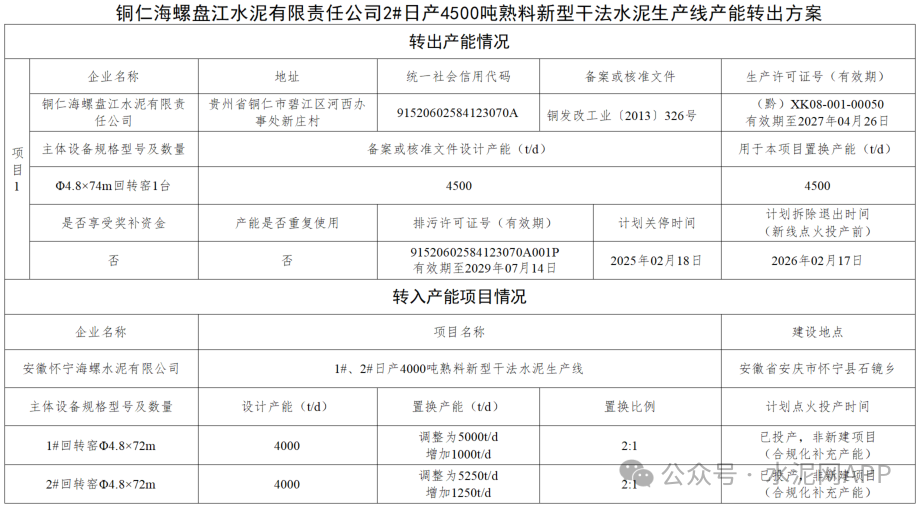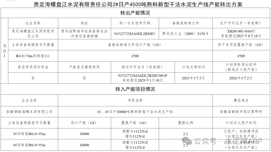 6月10日,貴州省工信廳發(fā)布“關(guān)于貴定海螺盤江水泥有限責(zé)任公司2#日產(chǎn)4500噸熟料新型干法水泥生產(chǎn)線 產(chǎn)能轉(zhuǎn)出方案的公告”及“關(guān)于銅仁海螺盤江水泥有限責(zé)任公司2#日產(chǎn)4500噸熟料新型干法水泥生產(chǎn)線產(chǎn)能轉(zhuǎn)出方案的公告”。根據(jù)公告,貴定海螺盤江水泥關(guān)停退出一條4500t/d熟料生產(chǎn)線,產(chǎn)能用于補(bǔ)充安徽銅陵海螺水泥兩條萬噸線,置換比例2:1。