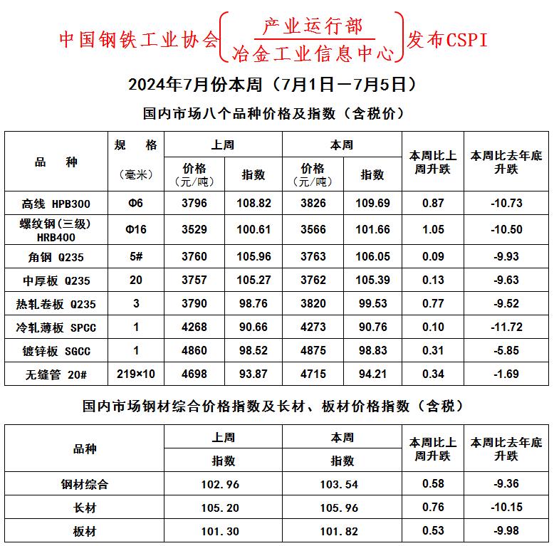 2024年7月份本周(7月1日-7月5日)國內市場八個品種價格及指數(shù)