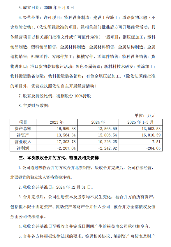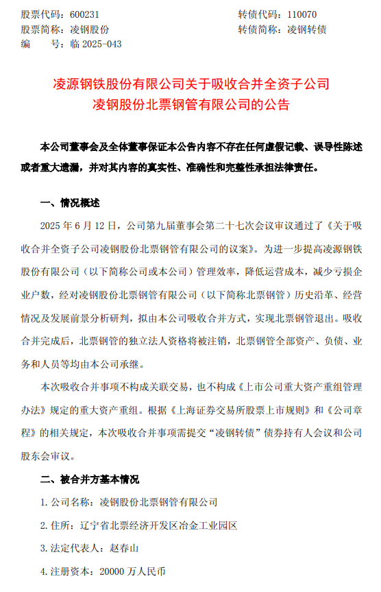 6月13日,凌鋼股份發(fā)布了《凌源鋼鐵股份有限公司關(guān)于吸收合并全資子公司凌鋼股份北票鋼管有限公司的公告》(以下簡(jiǎn)稱《公告》)。