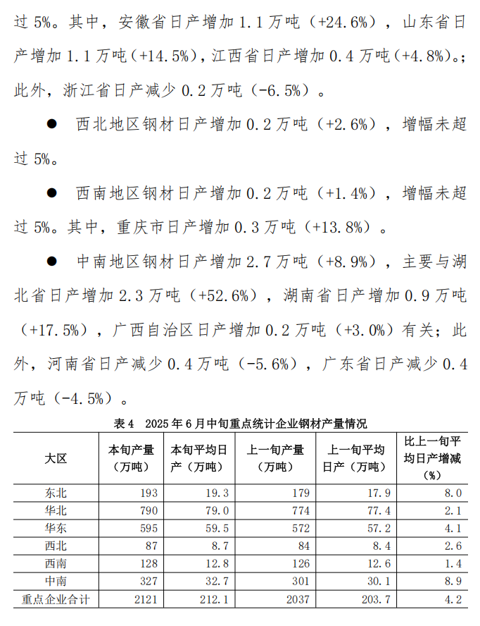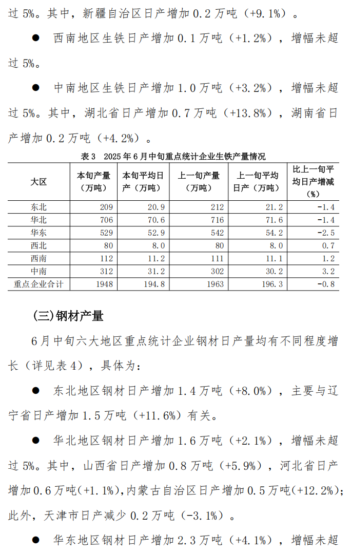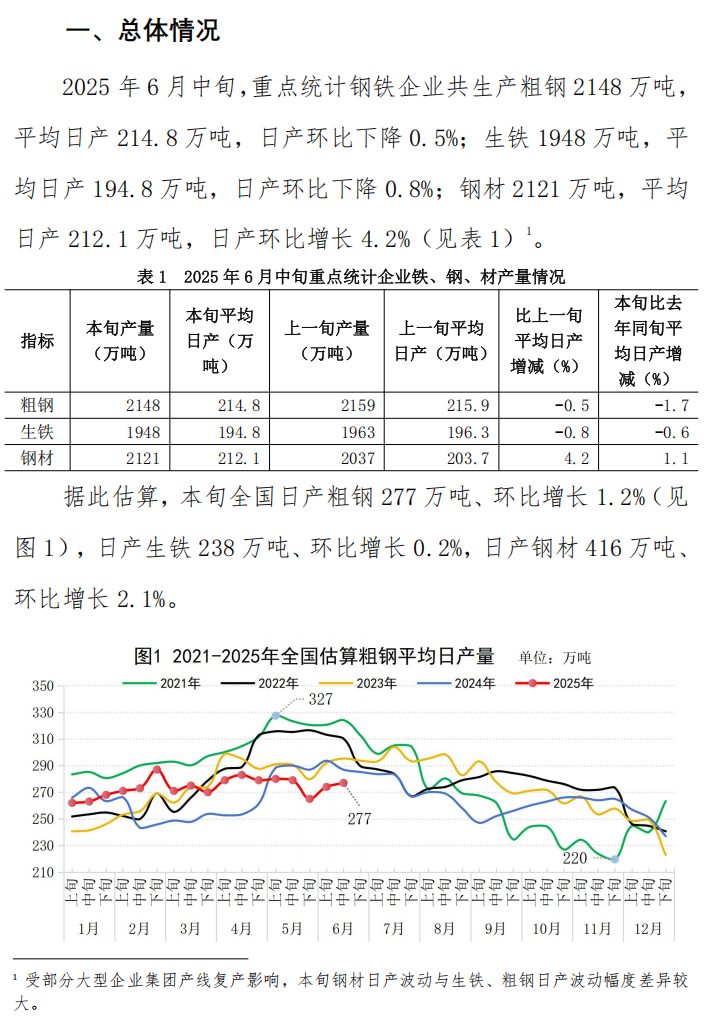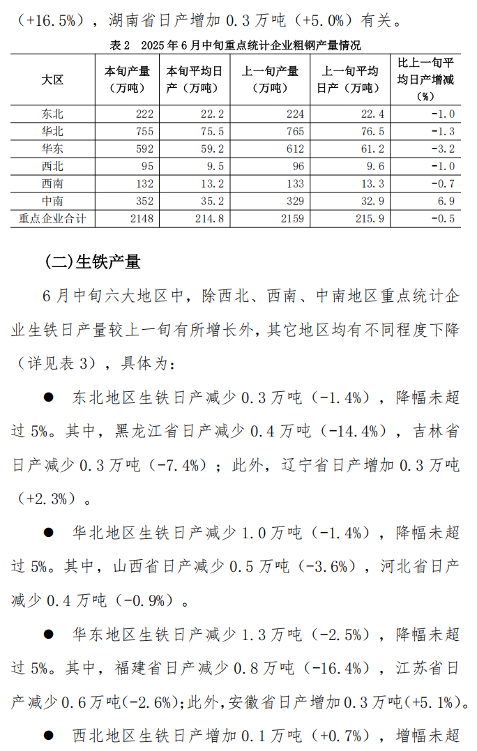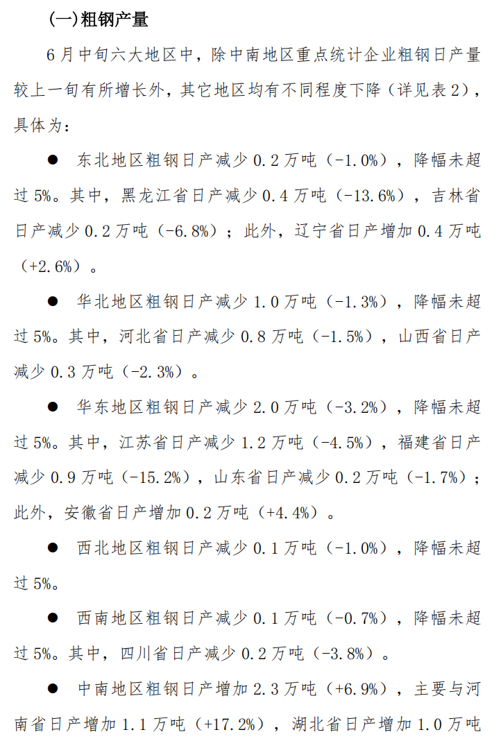6月中旬重點統(tǒng)計企業(yè)鋼鐵產(chǎn)量旬報