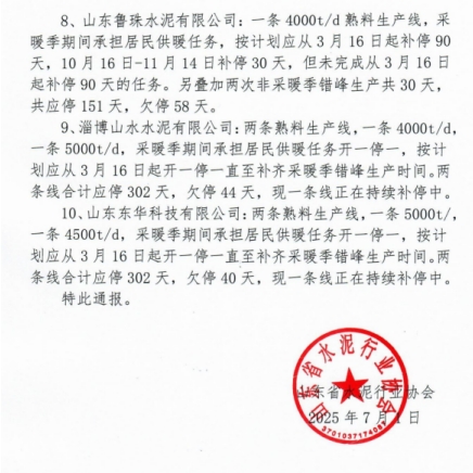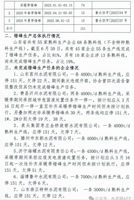 近日,山東省水泥行業(yè)協(xié)會發(fā)布“關(guān)于水泥熟料企業(yè)錯峰生產(chǎn)執(zhí)行情況通報”稱,山東省共有55家熟料生產(chǎn)企業(yè)68條熟料線(不含特種熟料生產(chǎn)線),截至6月30日,共有45家企業(yè)55條生產(chǎn)線完成了錯峰生產(chǎn)任務(wù),占比81%,另有10家企業(yè)涉13條熟料線,尚未完成錯峰生產(chǎn)任務(wù),占比19%。全文如下: