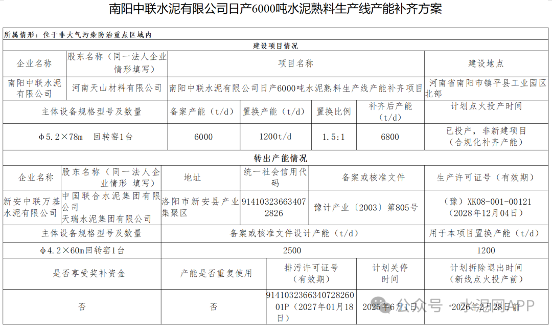 公示顯示,南陽中聯(lián)水泥6000t/d熟料生產線置換補充產能800t/d,補充后產能6800t/d,退出產能來自新安中聯(lián)萬基水泥2500t/d生產線中的1200t/d,置換比例1.5:1。
